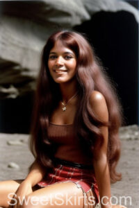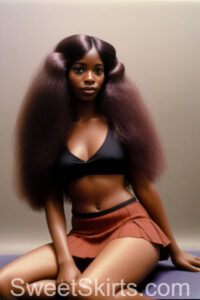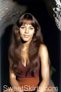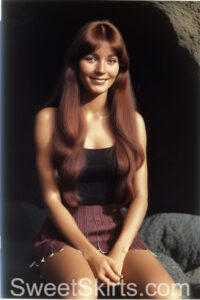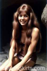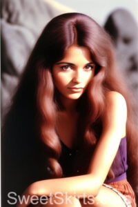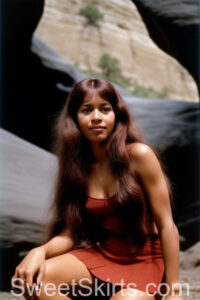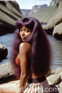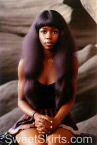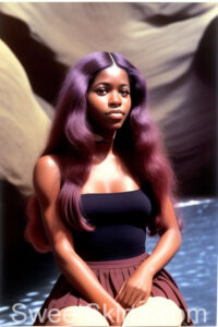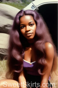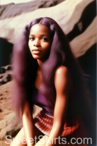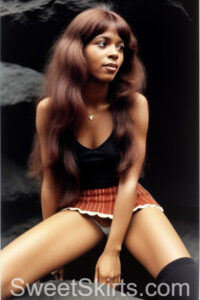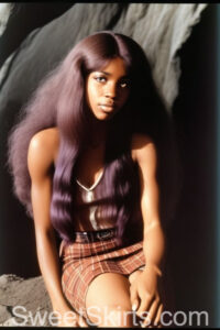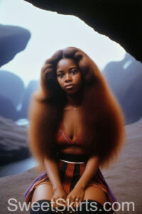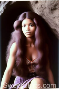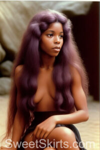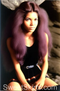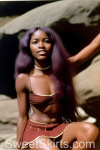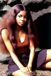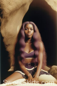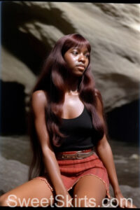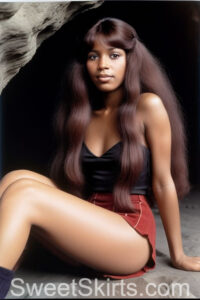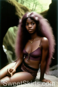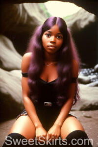 A closeup 1970s photo view of an extremely attractive, pretty women of Color with very long, flowing purple and red hair. They are wearing a black (sometimes other color) short mini skirt or dress, sitting down in front of a sealed, very dark black cave. The atmosphere is mysterious, with shadows from the cave creating a dramatic contrast, and the lighting emphasizes their beauty and elegance in the scene.