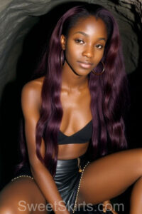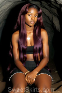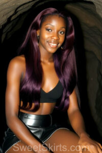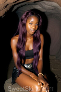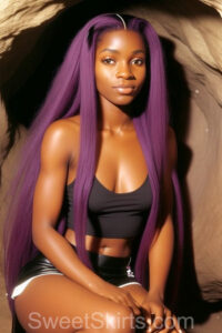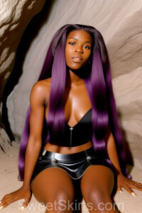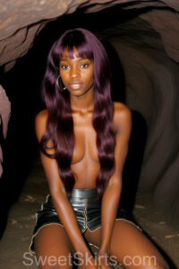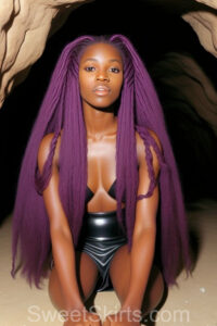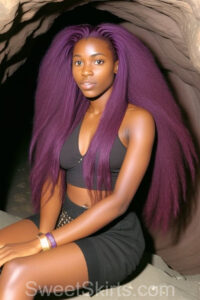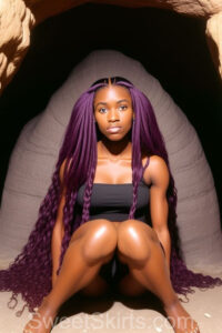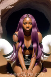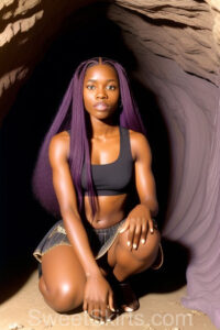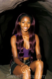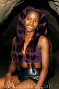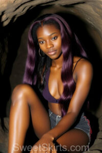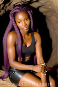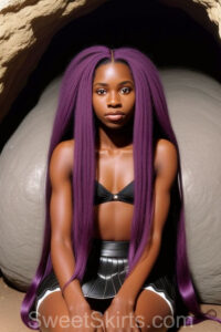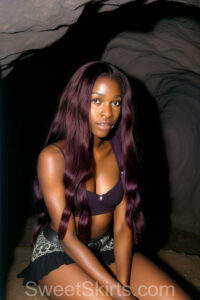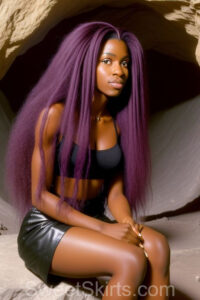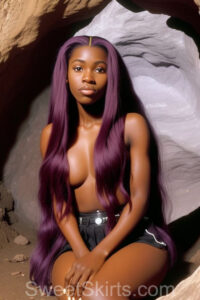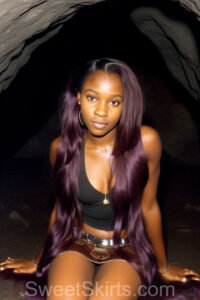 A closeup 1990s photo view of an extremely attractive, pretty women of Color with very long, flowing purple and red hair. They are wearing a black (sometimes other color) short mini skirt or dress, sitting down in front of a sealed, very dark black cave. The atmosphere is mysterious, with shadows from the cave creating a dramatic contrast, and the lighting emphasizes their beauty and elegance in the scene.