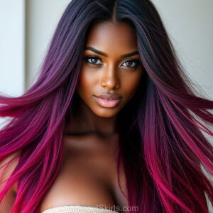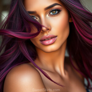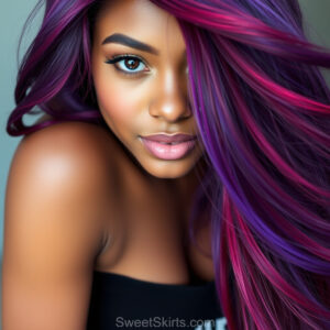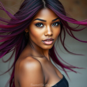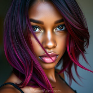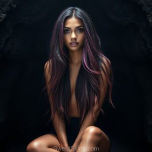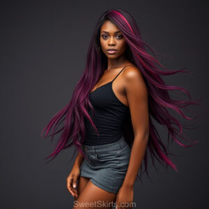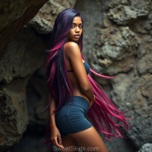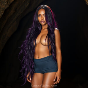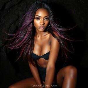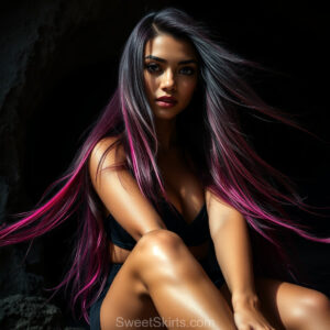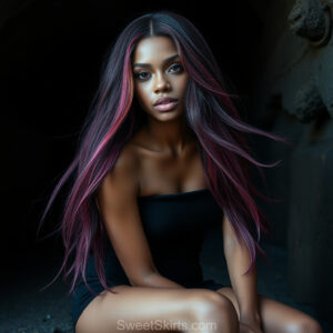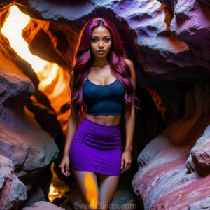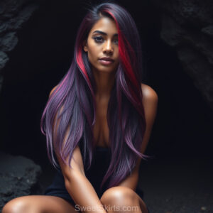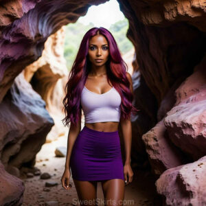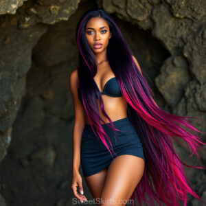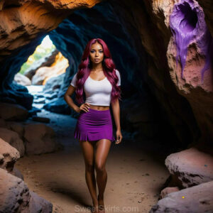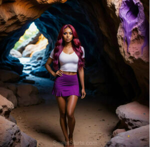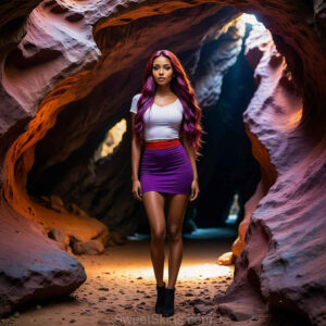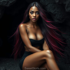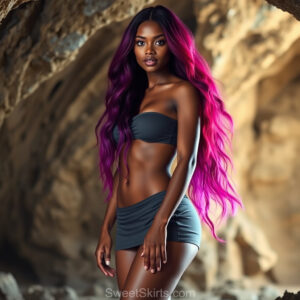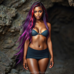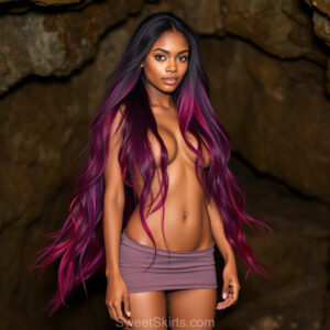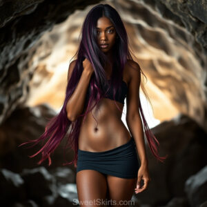 A closeup mixed batch of photo view of an extremely attractive, pretty women of Color with very long, flowing purple and red hair. They are wearing a black (sometimes other color) short mini skirt or dress, sitting and standing images in front of a sealed, very dark black cave. The atmosphere is mysterious, with shadows from the cave creating a dramatic contrast, and the lighting emphasizes their beauty and elegance in the scene.