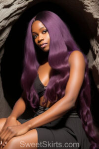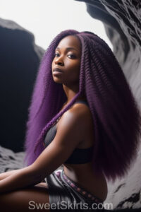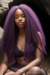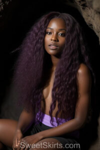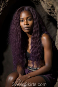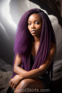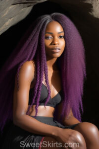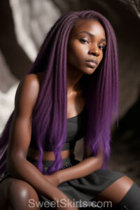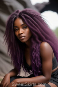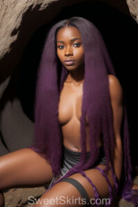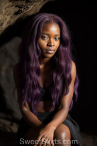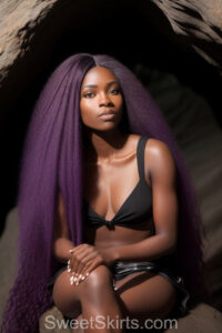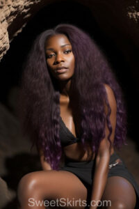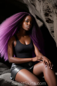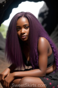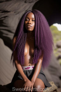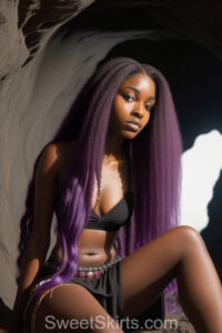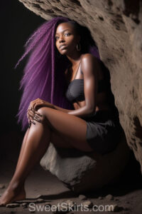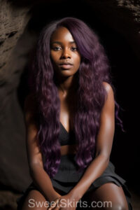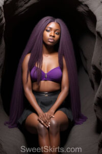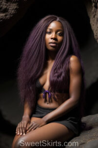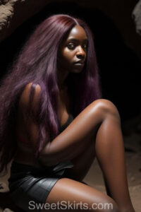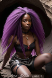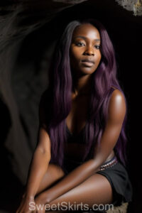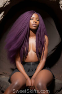 A closeup professional photo view of an extremely attractive, pretty women of Color with very long, flowing purple and red hair. They are wearing a black short mini skirt, sitting down in front of a sealed, very dark black cave. The atmosphere is mysterious, with shadows from the cave creating a dramatic contrast, and the lighting emphasizes their beauty and elegance in the scene.