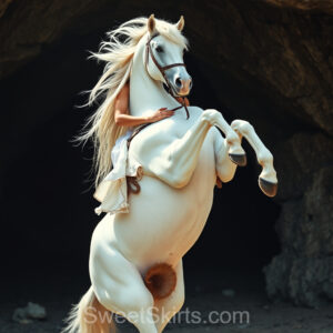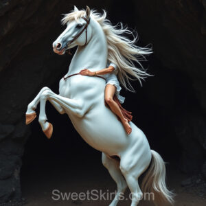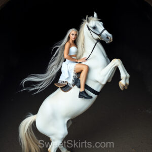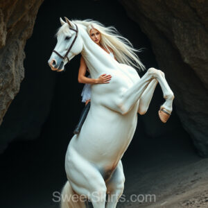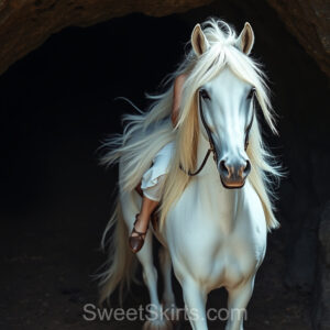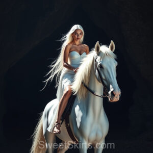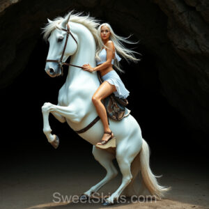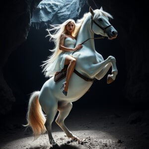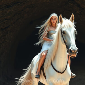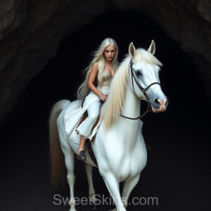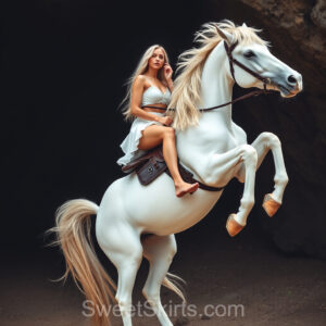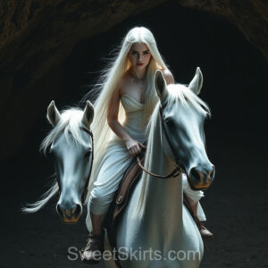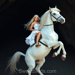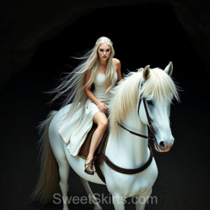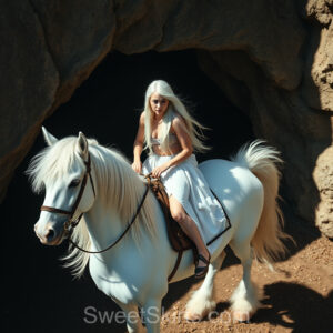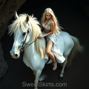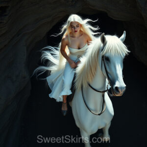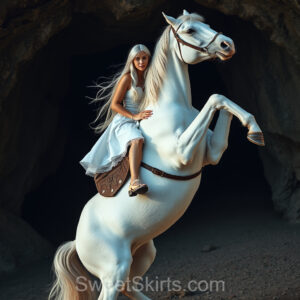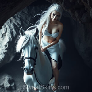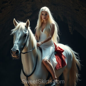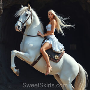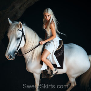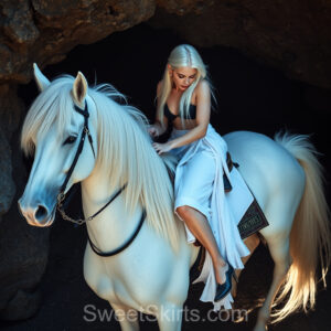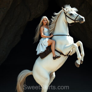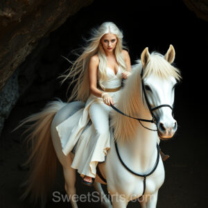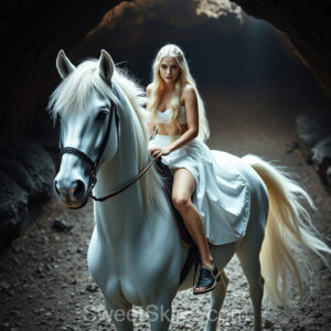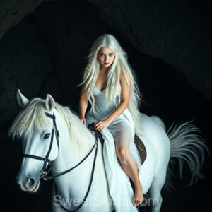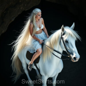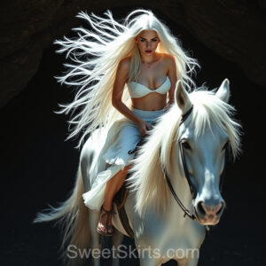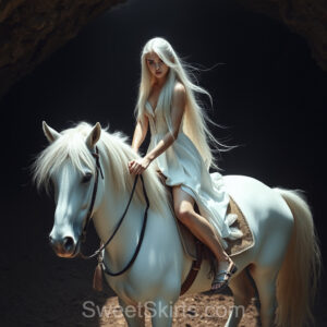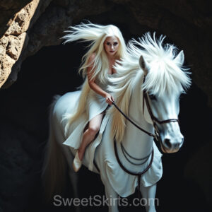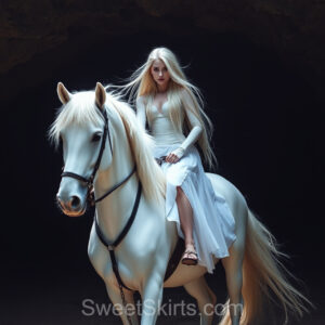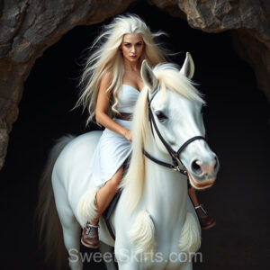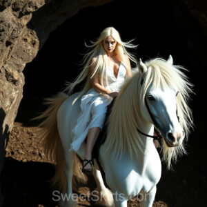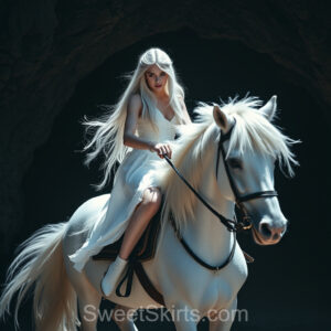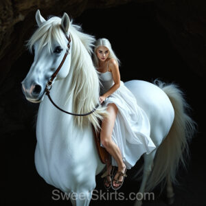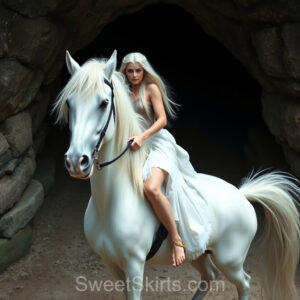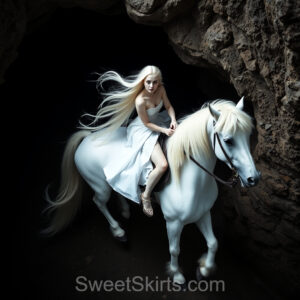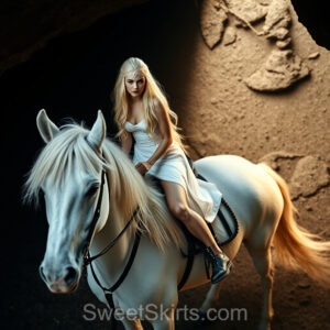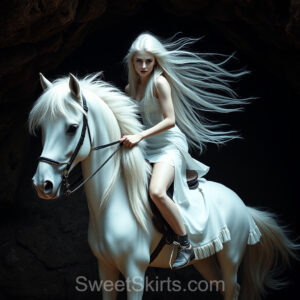 Captivating photo views of fair-skinned beauties that are an extremely attractive, pretty with very long, flowing white hair sitting and riding white horses. They are wearing a white (sometimes other color) short mini skirt and or dress/ skirt combos, on horseback sometimes in front of or in a cave setting. The atmosphere is mysterious, with shadows from the cave creating a dramatic contrast, and the lighting emphasizes their beauty and elegance in the scene.