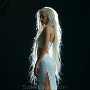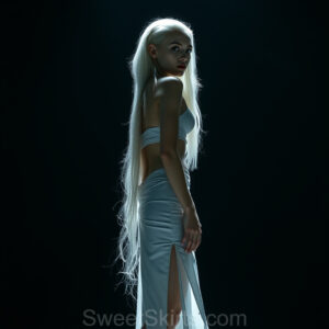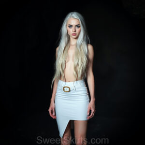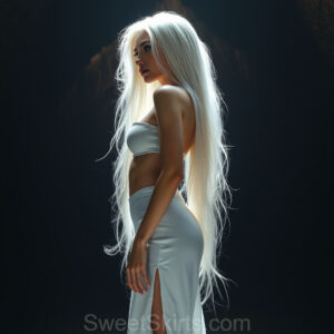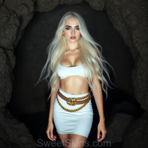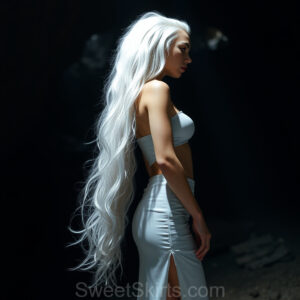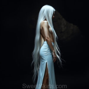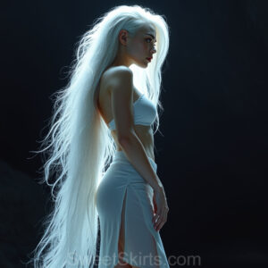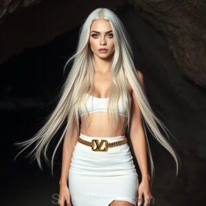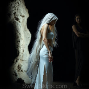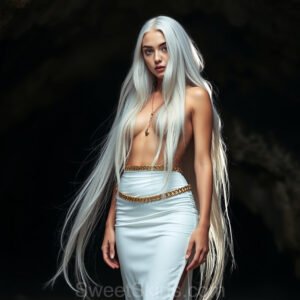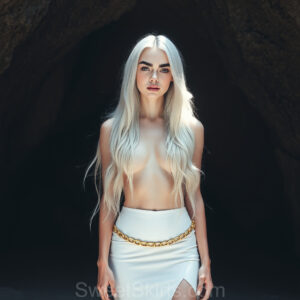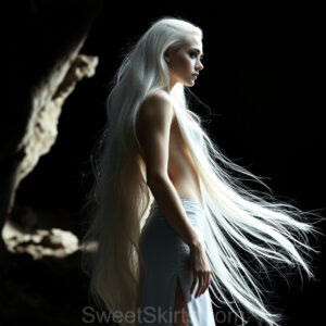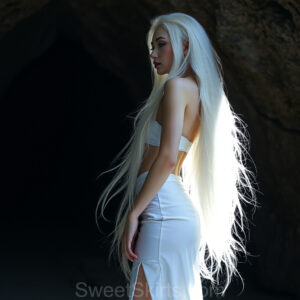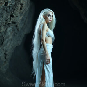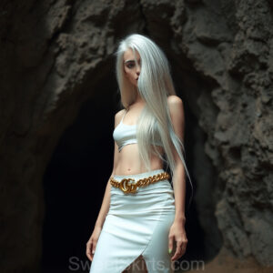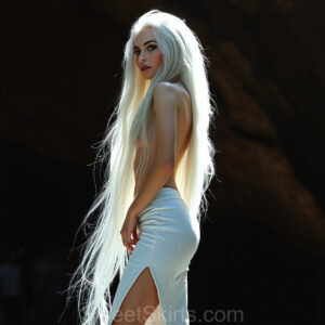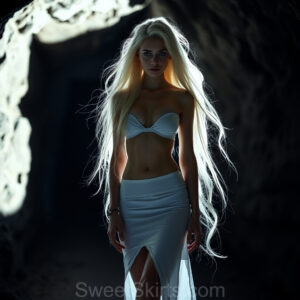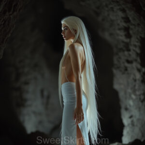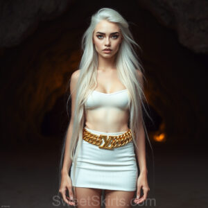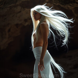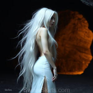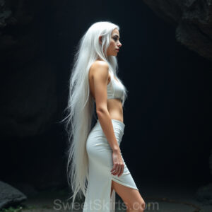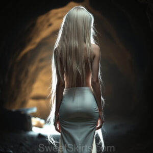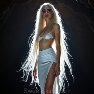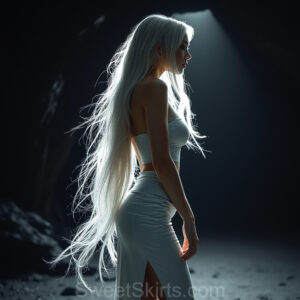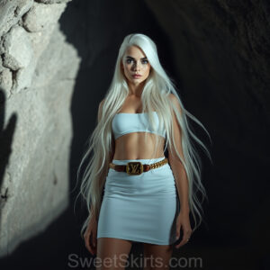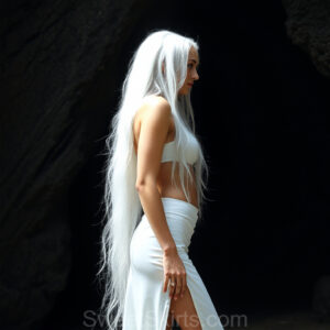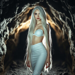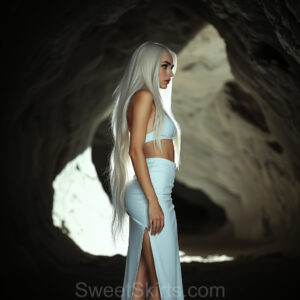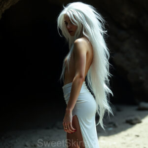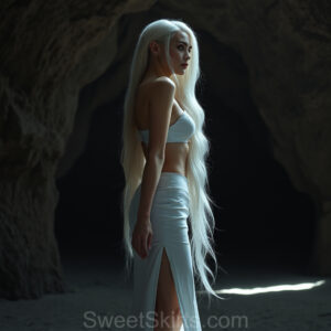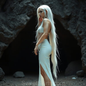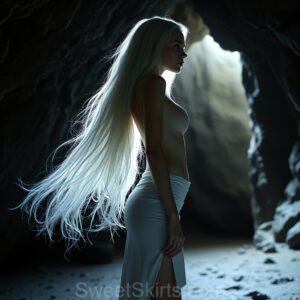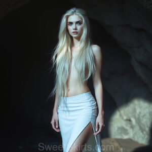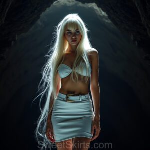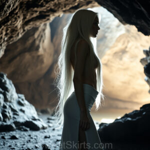 Captivating photo views of fair-skinned beauties that are an extremely attractive, pretty with very long, flowing white hair. They are wearing a white (sometimes other color) short mini skirt and or dress/ skirt combos, standing in front of or in a cave setting. The atmosphere is mysterious, with shadows from the cave creating a dramatic contrast, and the lighting emphasizes their beauty and elegance in the scene.