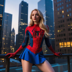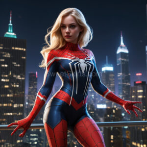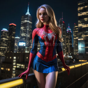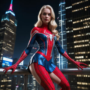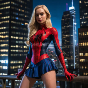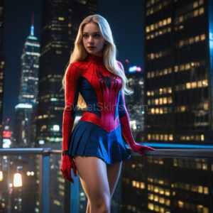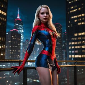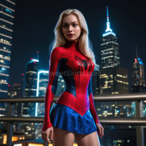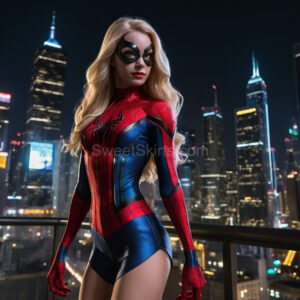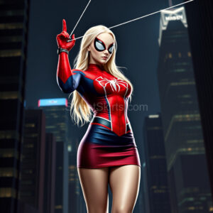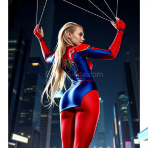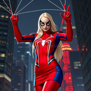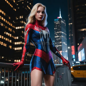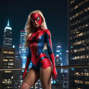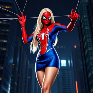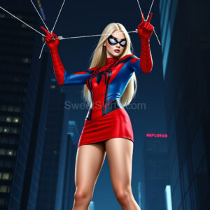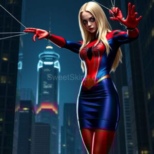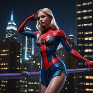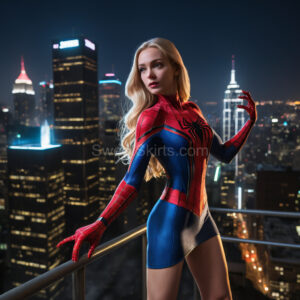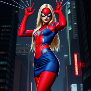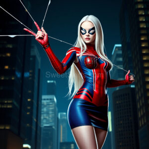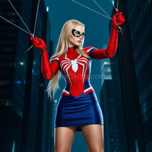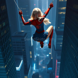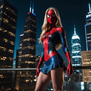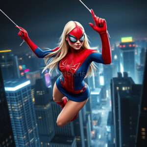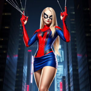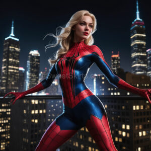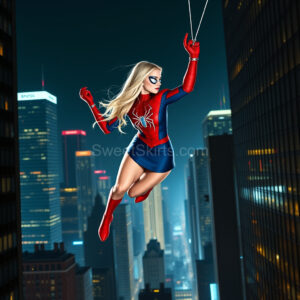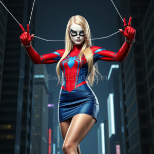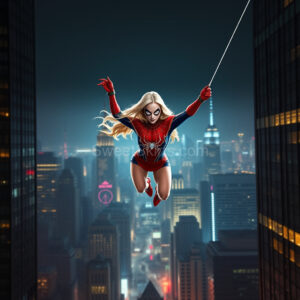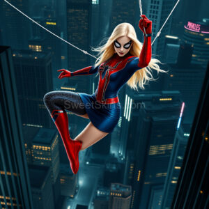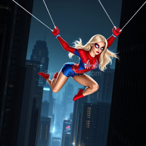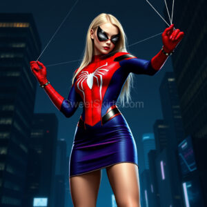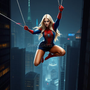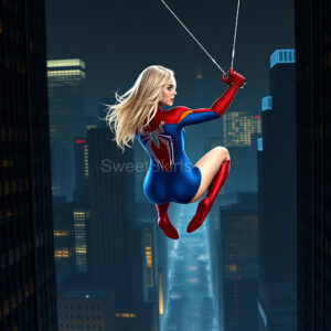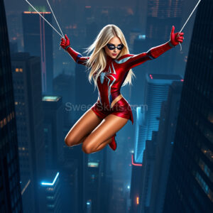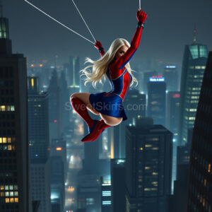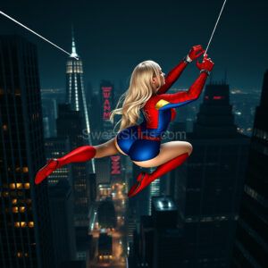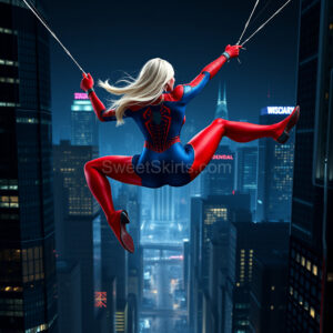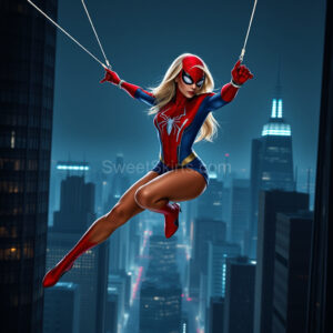 As she moves effortlessly between skyscrapers, her hair streams wildly in the wind, enhancing the sense of speed and power. In the classic web-shooting pose, white web strands shoot from her wrists, cutting through the night sky as she swings with confidence, bringing a bold and captivating energy to this unique, alluring take on the superhero.