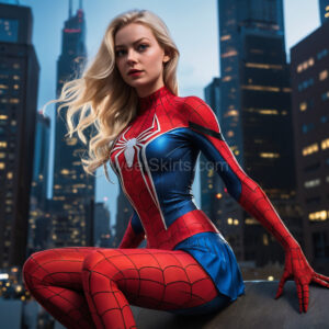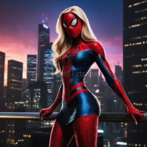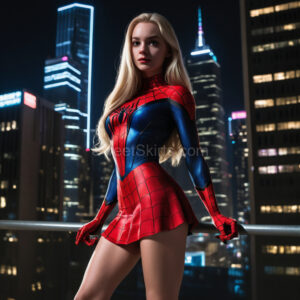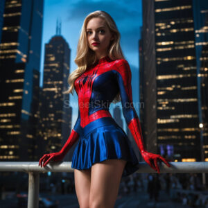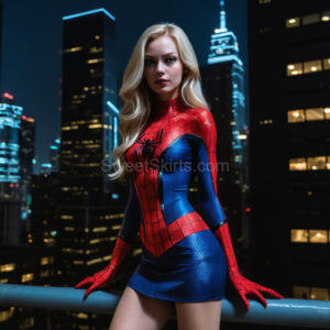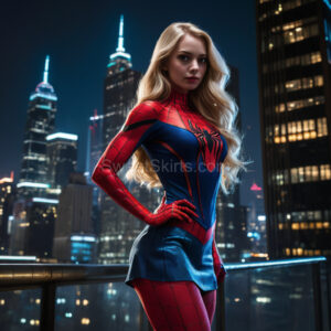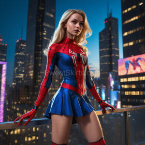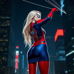 A striking female version of Spiderman, with pale skin and long, flowing blonde hair, swings through a neon-lit city skyline in bold superhero fashion. Instead of the usual pants, she wears a daringly short, tight-fitting miniskirt that stays true to the classic Spiderman red and blue colors, accentuating her slim, athletic figure. Her bare legs are revealed, adding a seductive twist to her appearance, while her face is mostly uncovered, with a small mask only covering her eyes.