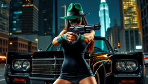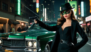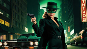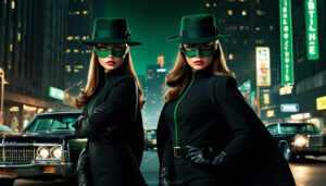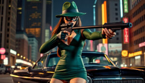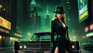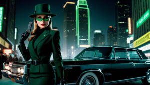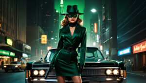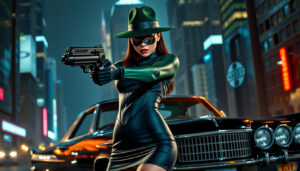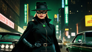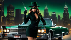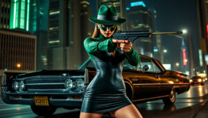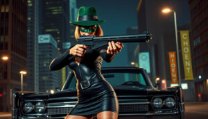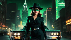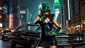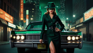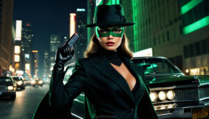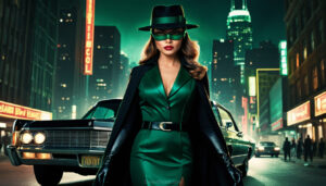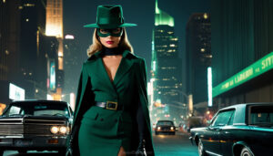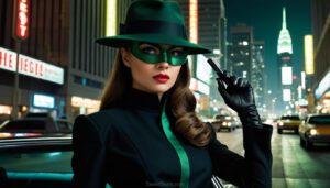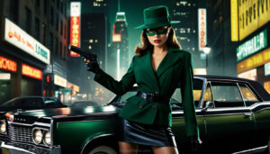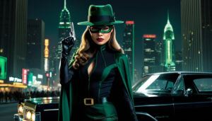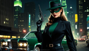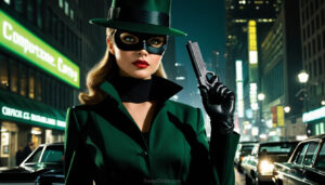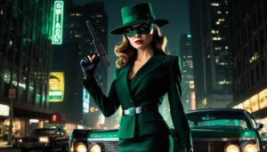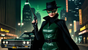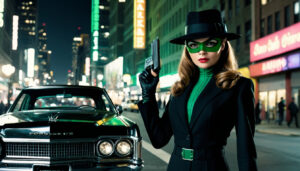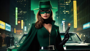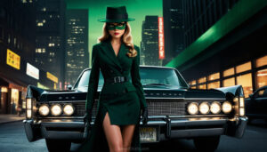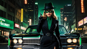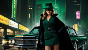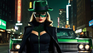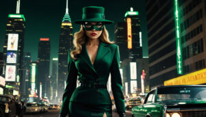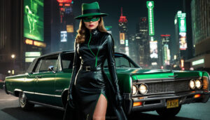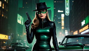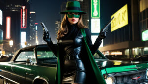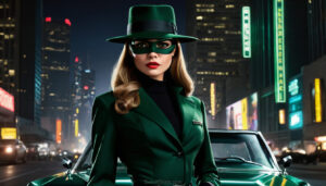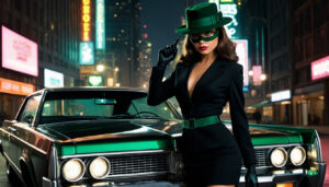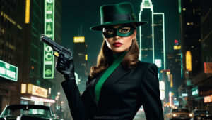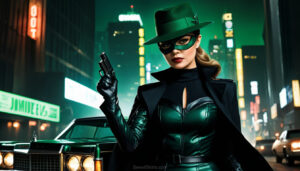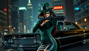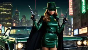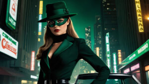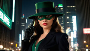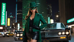 Her sleek, form-fitting costume pays homage to the classic Green Hornet while her extremely tight, very short miniskirt adds a modern, seductive twist. Every detail, from the perfectly tailored attire to the bold stance, emphasizes her strength, elegance, and allure in a world where justice and style converge.
