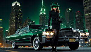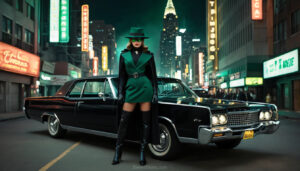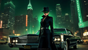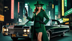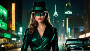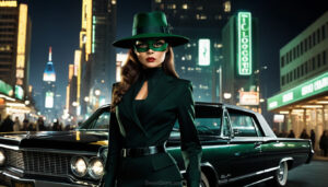 Step into a thrilling reimagining of an iconic vigilante. This striking image captures a slim, sexy female version of The Green Hornet, standing with unwavering confidence; sometimes set in  a vibrant urban nightscape. Some images (not all) are set in Towering skyscrapers, bathed in moonlight, form a powerful backdrop that radiates intrigue.
