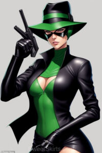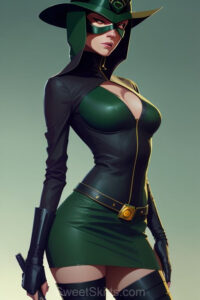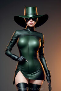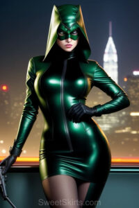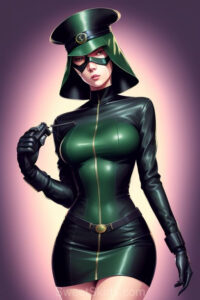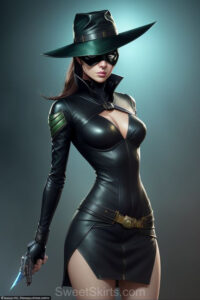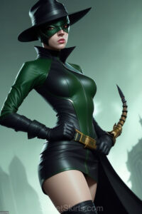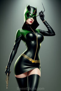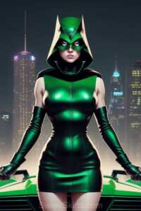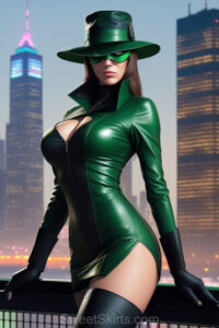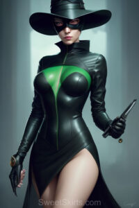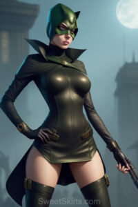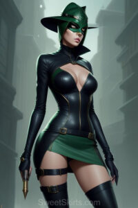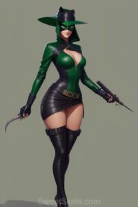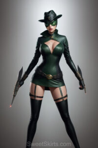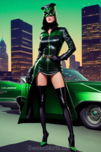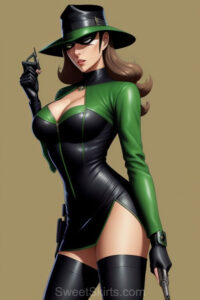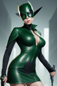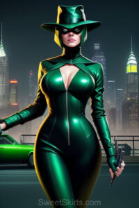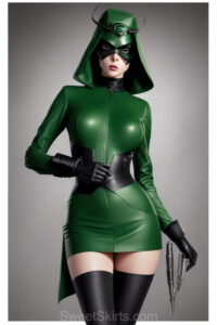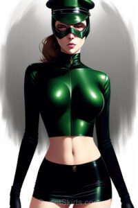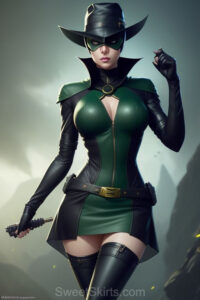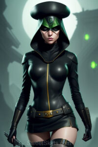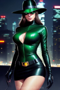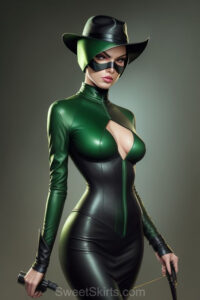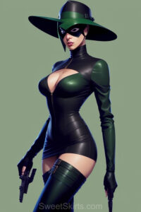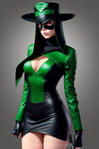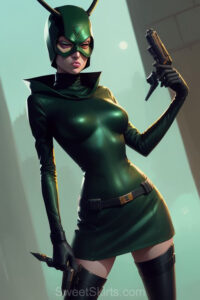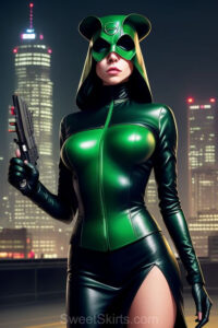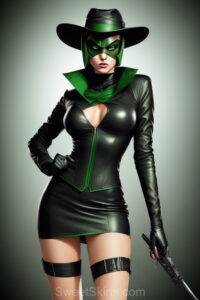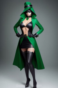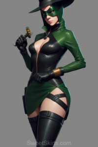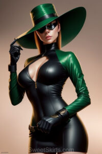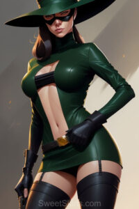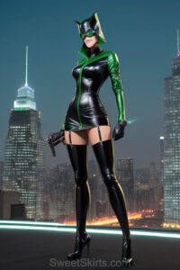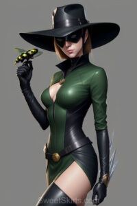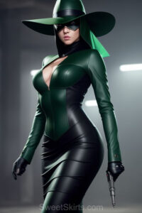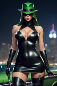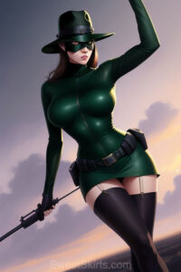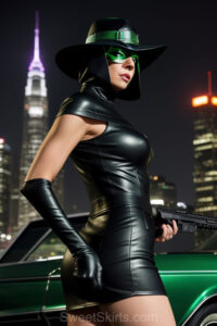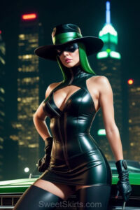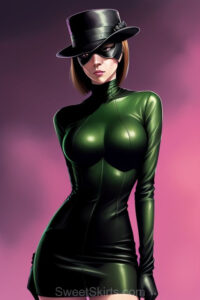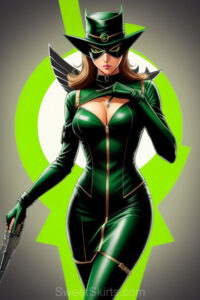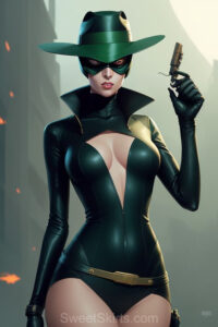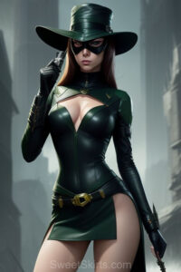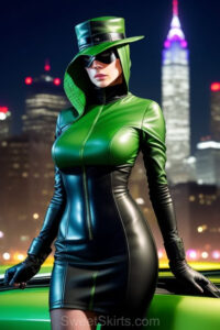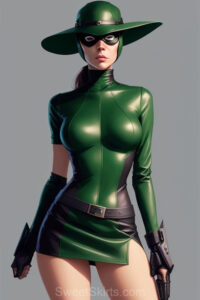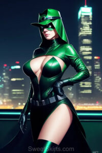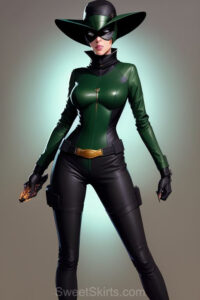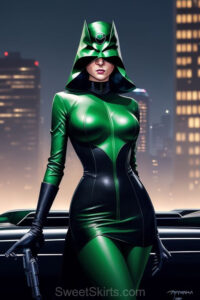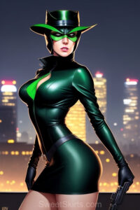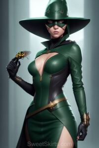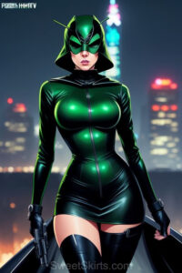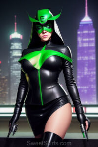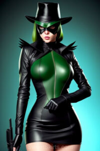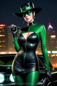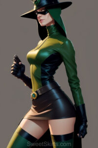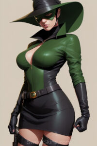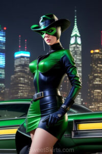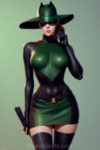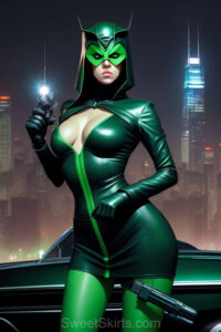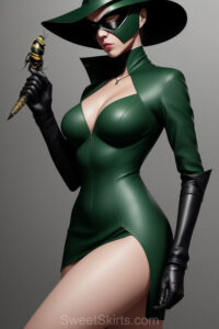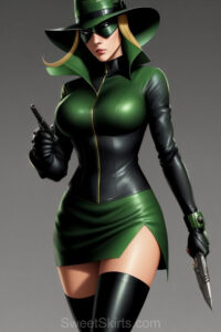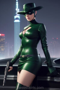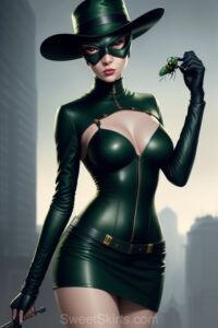 Her sleek, form-fitting costume pays homage to the classic Green Hornet while her extremely tight, very short miniskirt adds a modern, seductive twist. Every detail, from the perfectly tailored attire to the bold stance, emphasizes her strength, elegance, and allure in a world where justice and style converge.