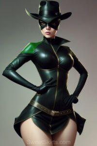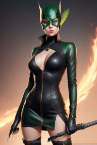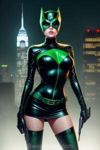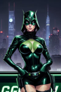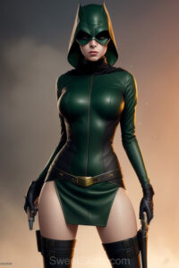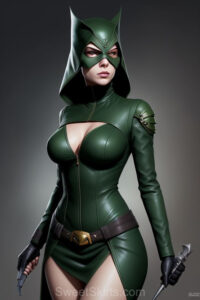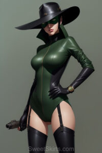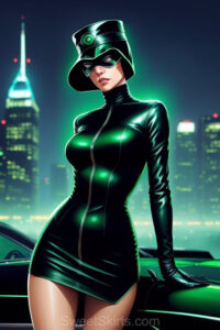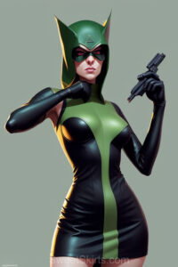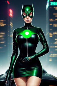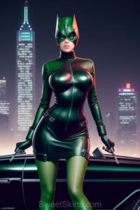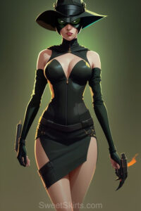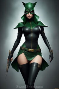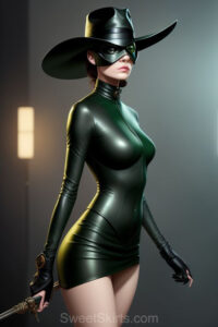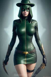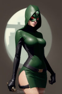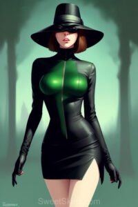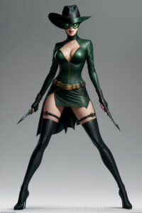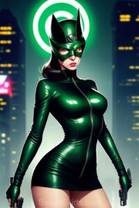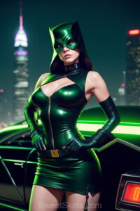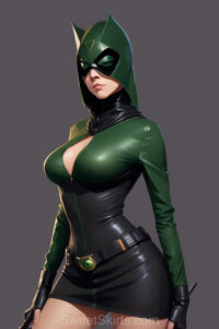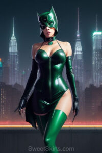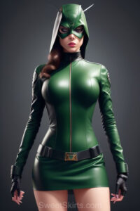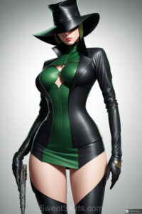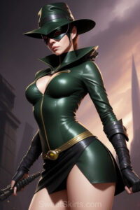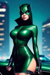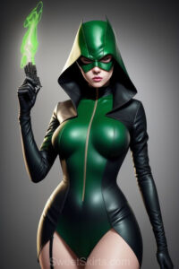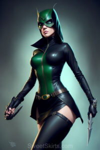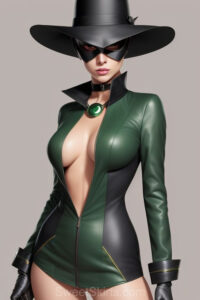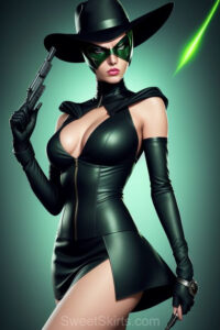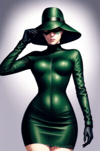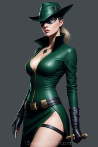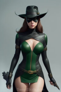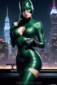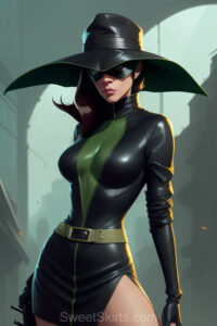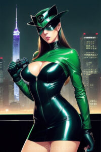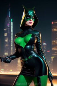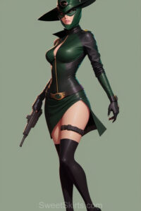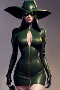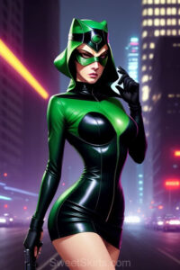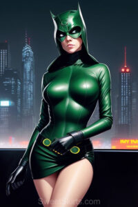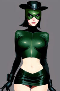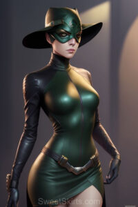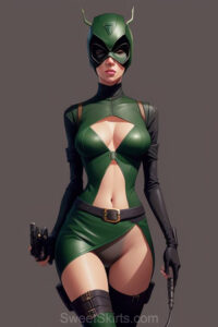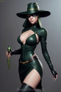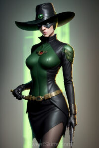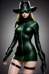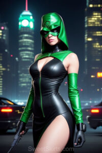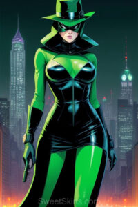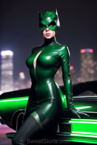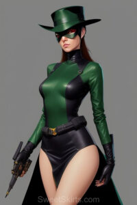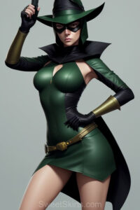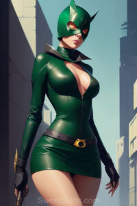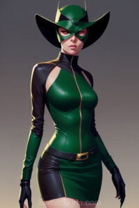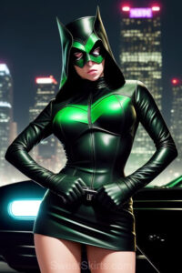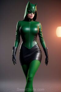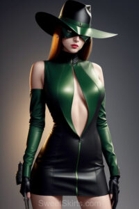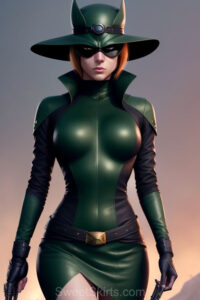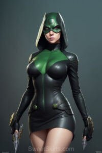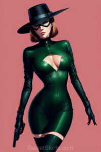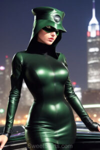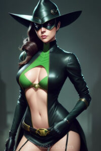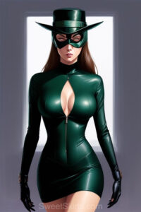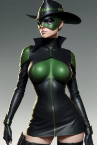 Her sleek, form-fitting costume pays homage to the classic Green Hornet while her extremely tight, very short miniskirt adds a modern, seductive twist. Every detail, from the perfectly tailored attire to the bold stance, emphasizes her strength, elegance, and allure in a world where justice and style converge.