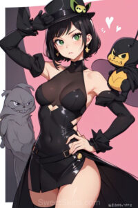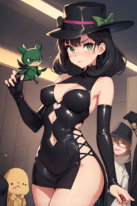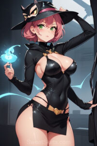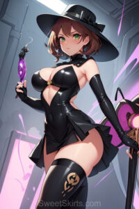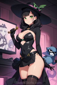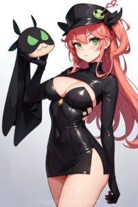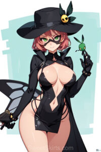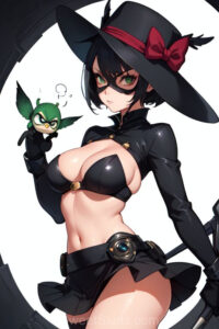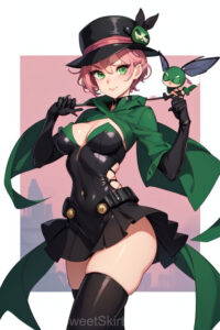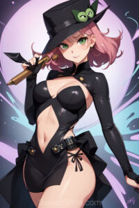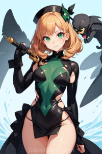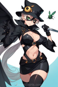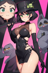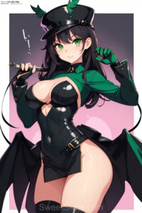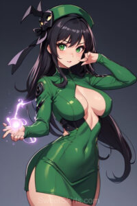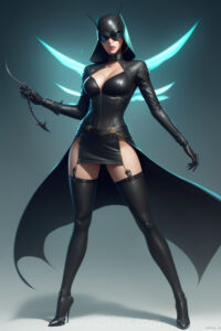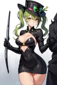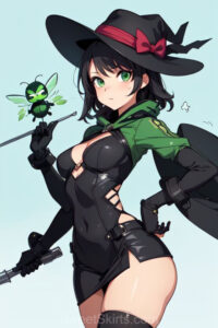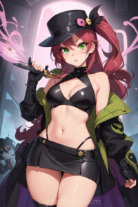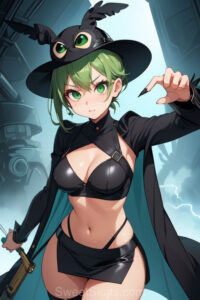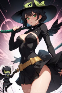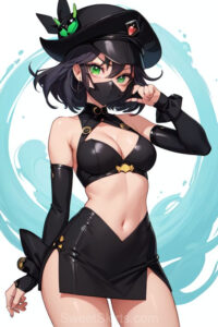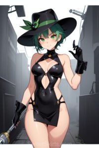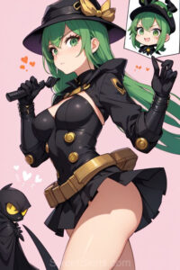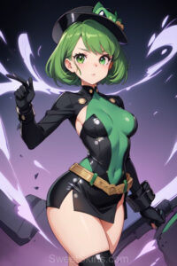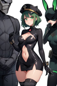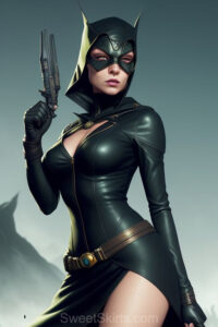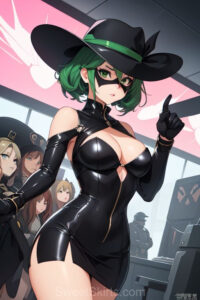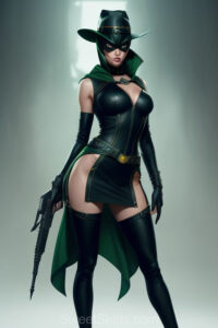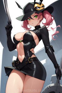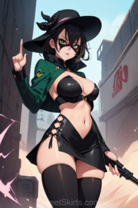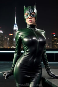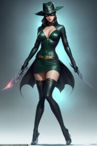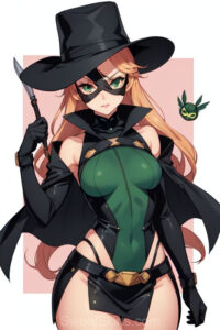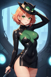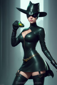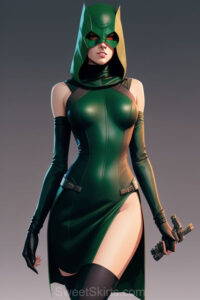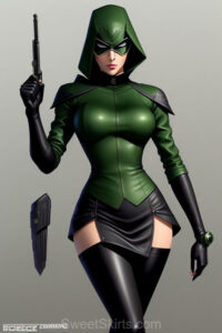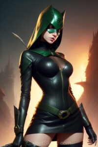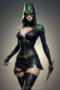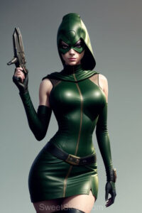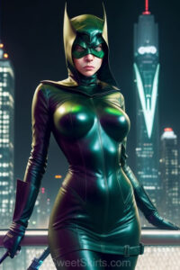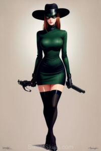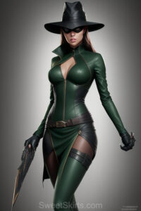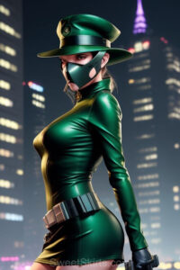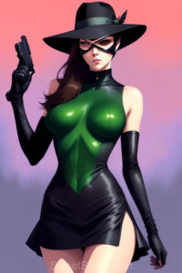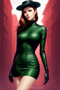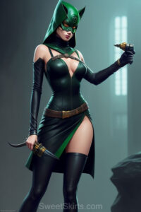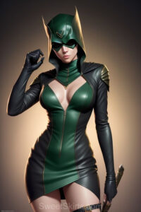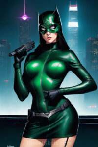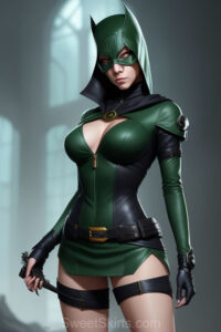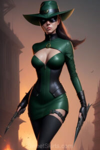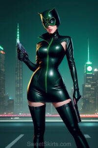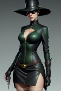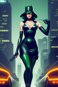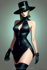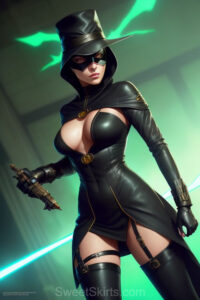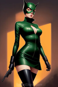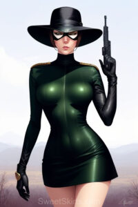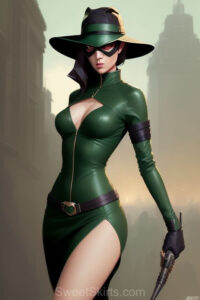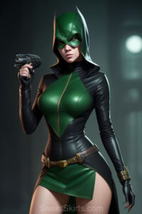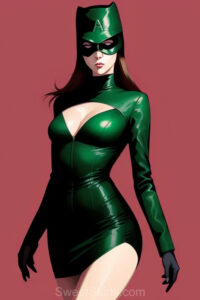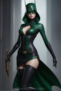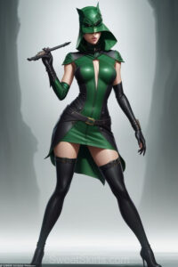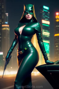 Her sleek, form-fitting costume pays homage to the classic Green Hornet while her extremely tight, very short miniskirt adds a modern, seductive twist. Every detail, from the perfectly tailored attire to the bold stance, emphasizes her strength, elegance, and allure in a world where justice and style converge.