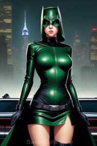 Step into a thrilling reimagining of an iconic vigilante. This striking image captures a slim, sexy female version of The Green Hornet, standing with unwavering confidence; sometimes set in  a vibrant urban nightscape. Some images (not all) are set in Towering skyscrapers, bathed in moonlight, form a powerful backdrop that radiates intrigue.