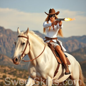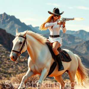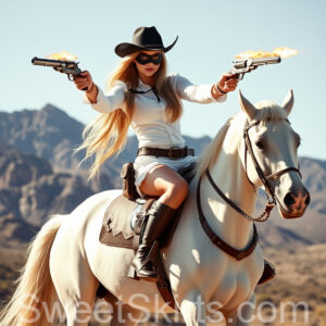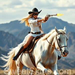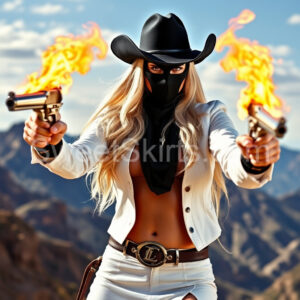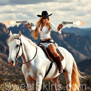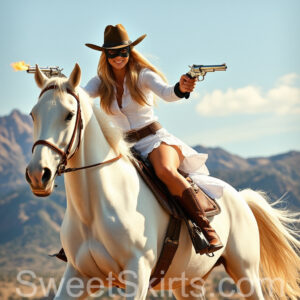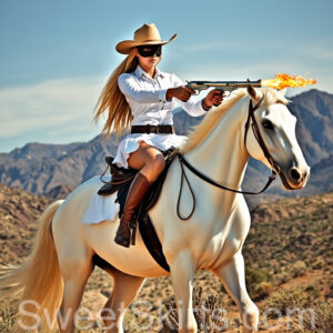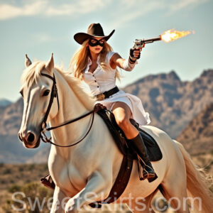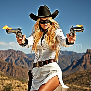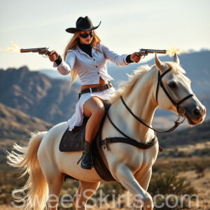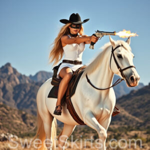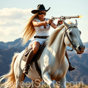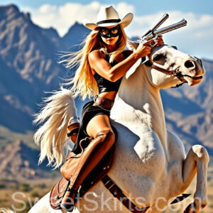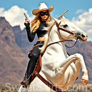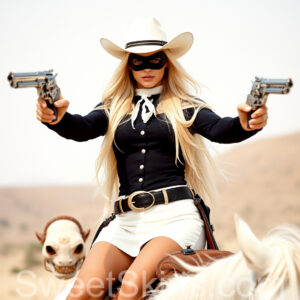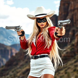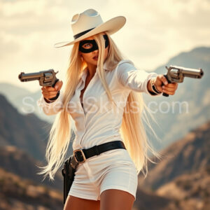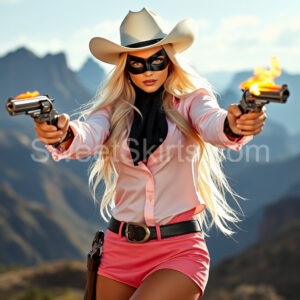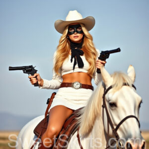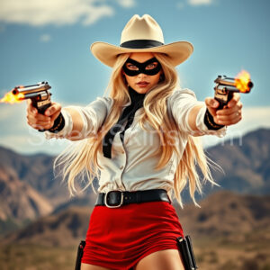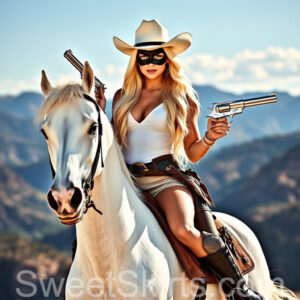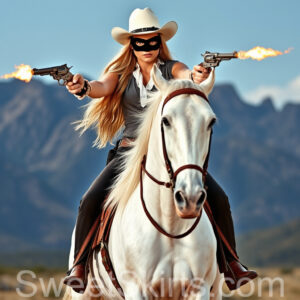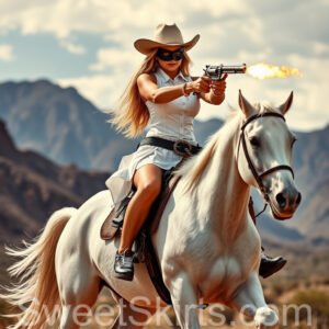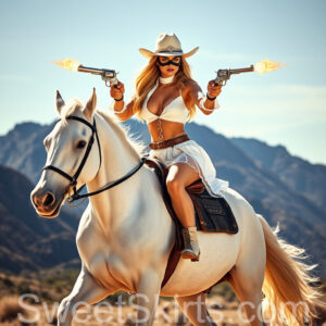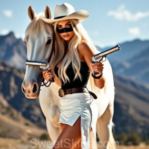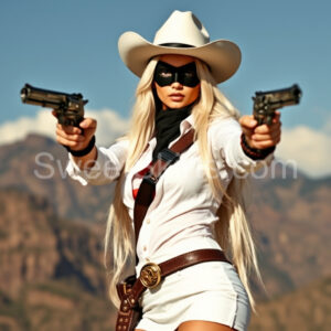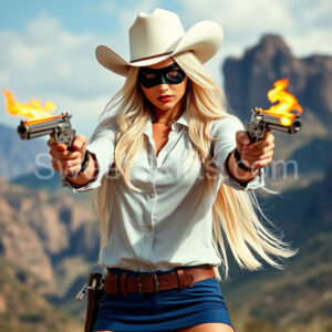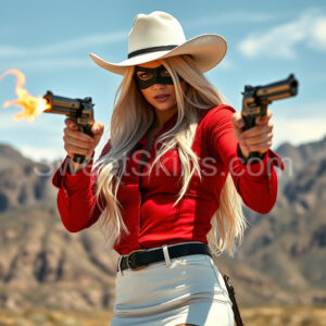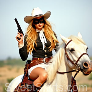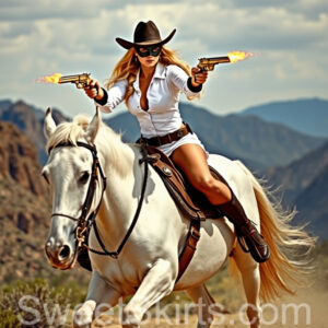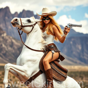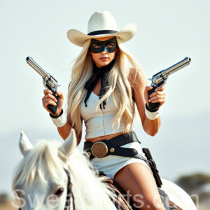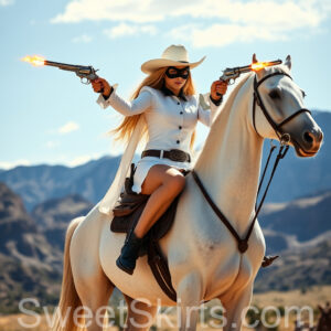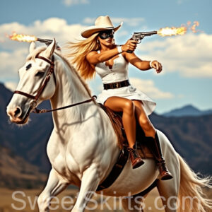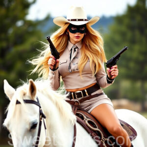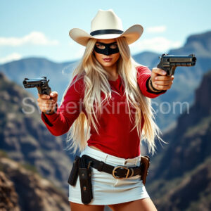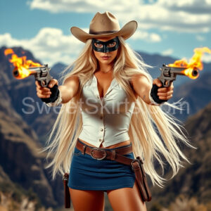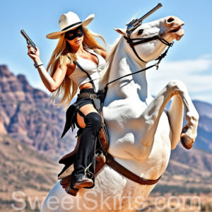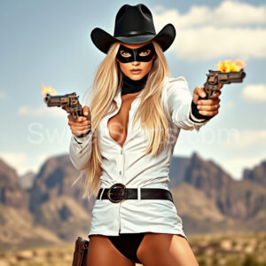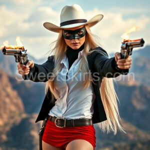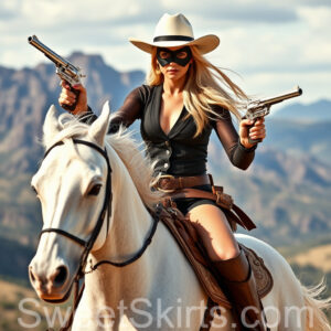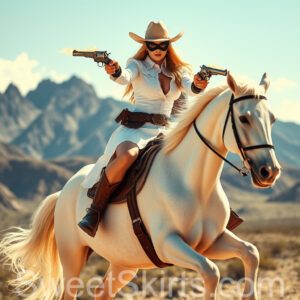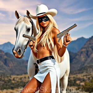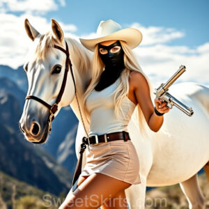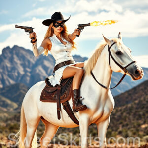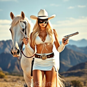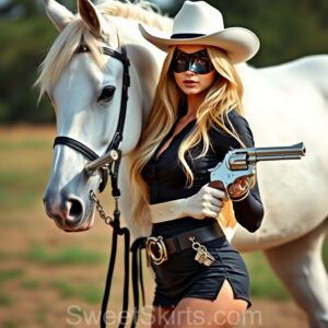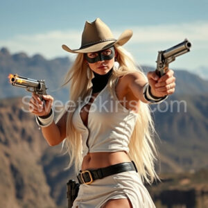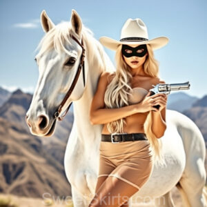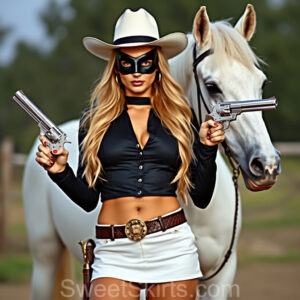 In this (Piclum) gallery, we present a bold reimagining of The Lone Ranger, portrayed as a confident and striking female character inspired by the classic TV show. She embodies strength and femininity, radiating a captivating blend of sex appeal, bravery, and elegance. With her commanding presence and side arms ready for action, this portrayal showcases what a true hero would look like in a sweet, stylish skirt—combining grace and power with a fierce sense of adventure.
