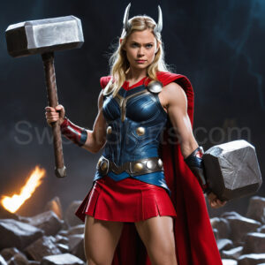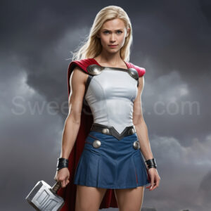 In these captivating visuals, she commands the scene wearing a sleek and fierce miniskirt, effortlessly blending strength with style. Wielding the legendary hammer Mjolnir—sometimes whole, sometimes in pieces—her confidence radiates, embodying the true essence of Thor.