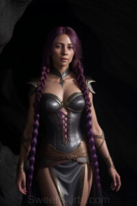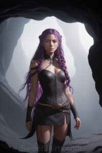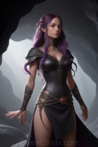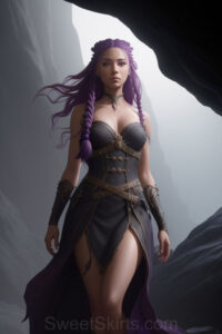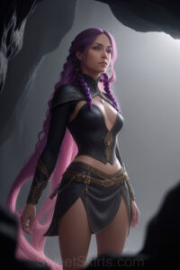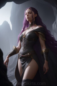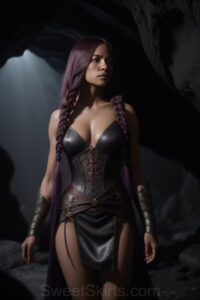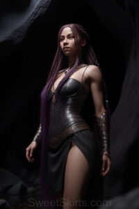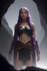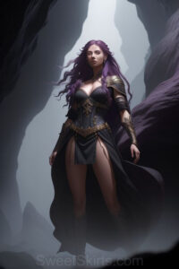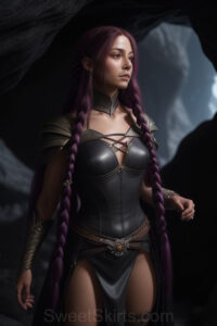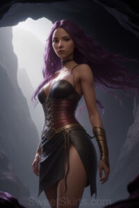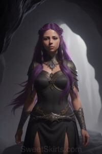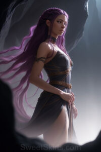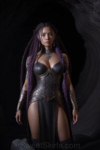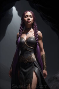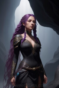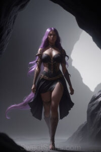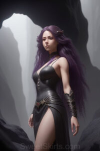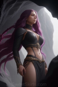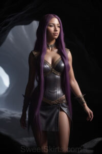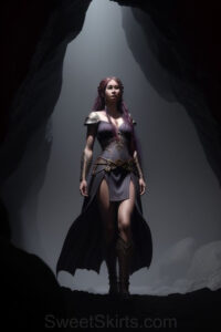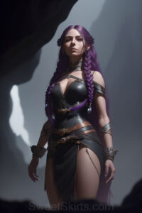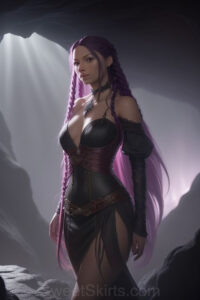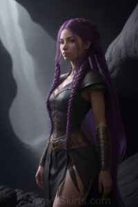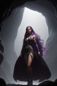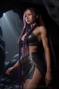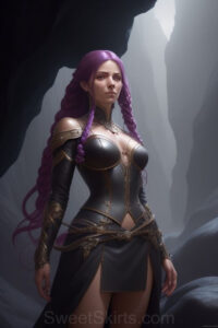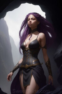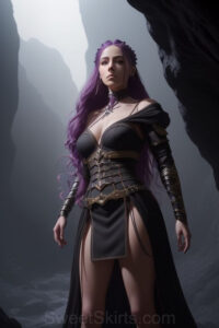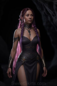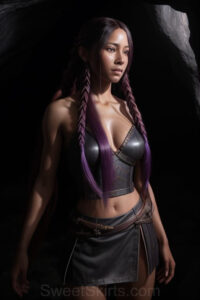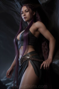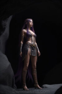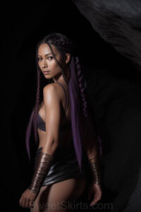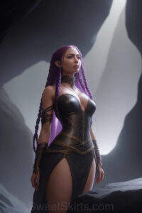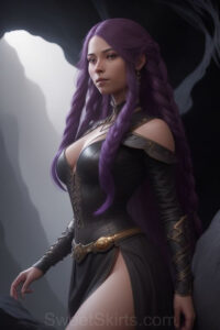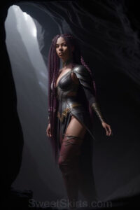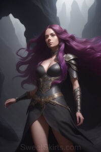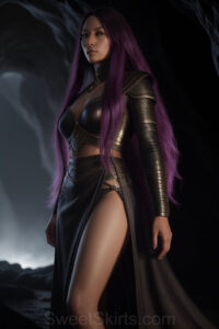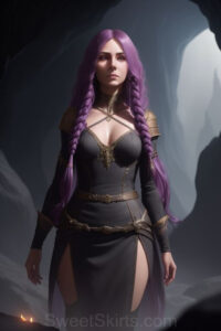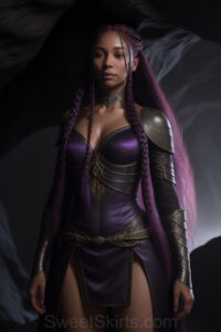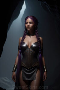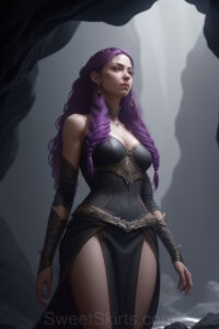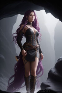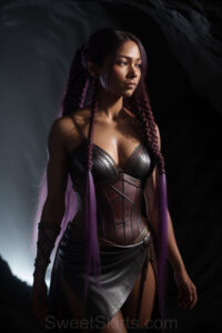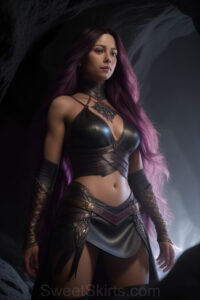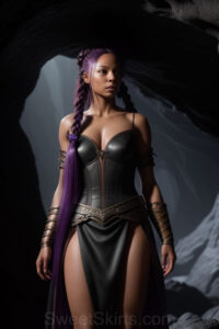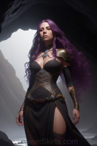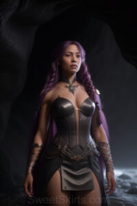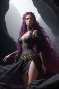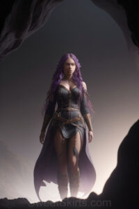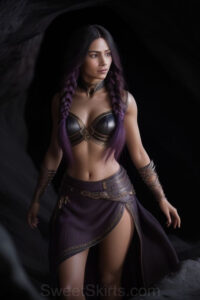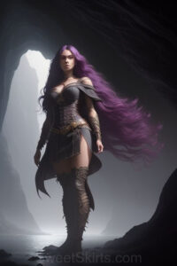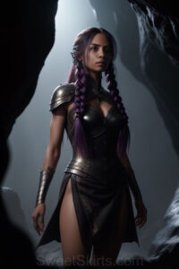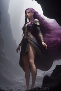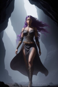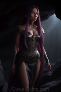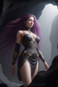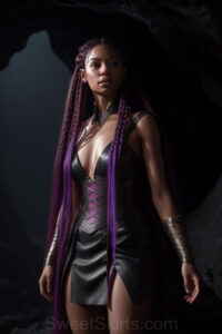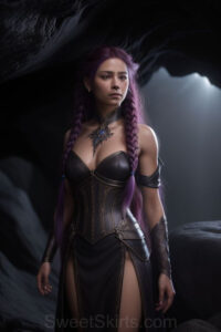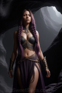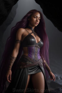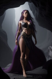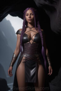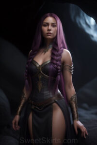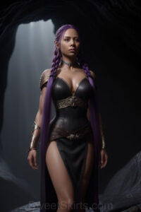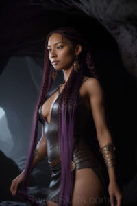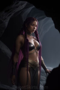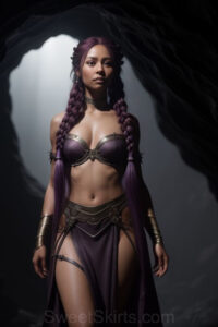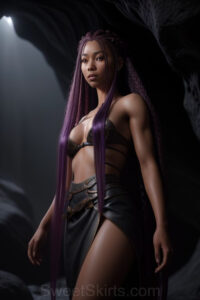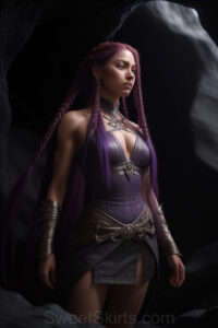 Dazzling images extremely attractive, pretty women of color with very long, flowing, purple and red, partially braided hair. They are wearing garmoutswith skirts from days of long ago, standing in front of, beside or in a cave setting. The atmosphere is mysterious, with shadows from the cave creating a dramatic contrast, and the lighting emphasizes their beauty and elegance in the scene.