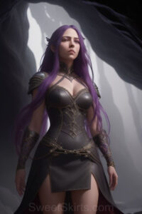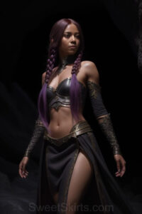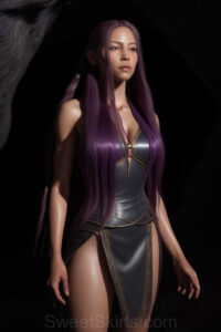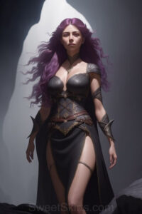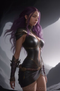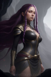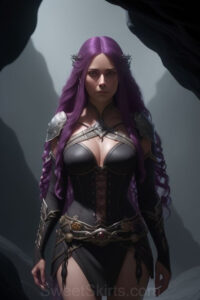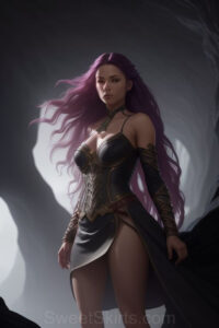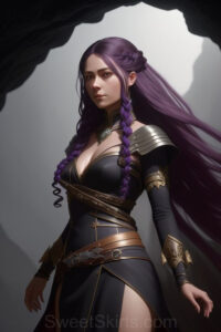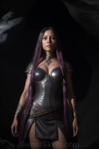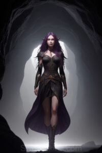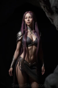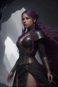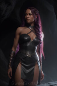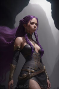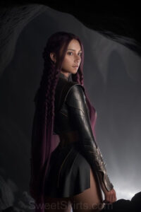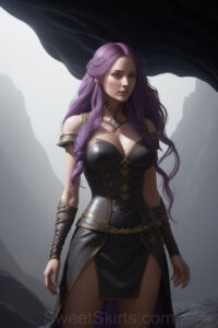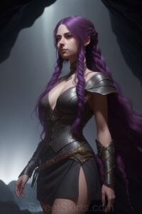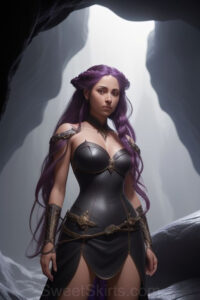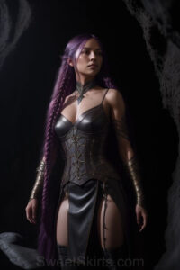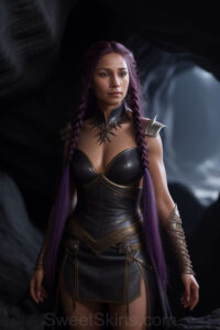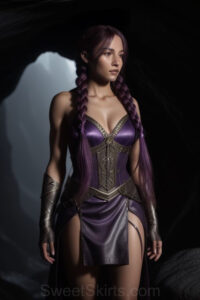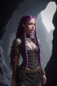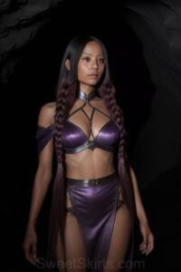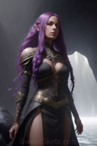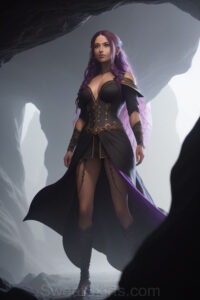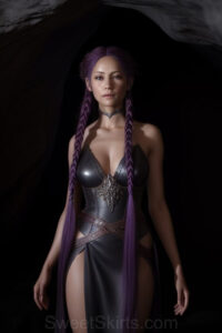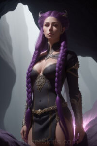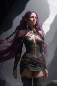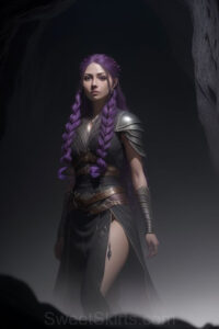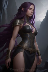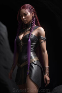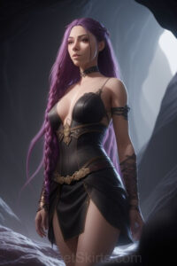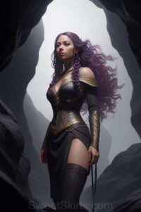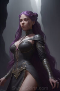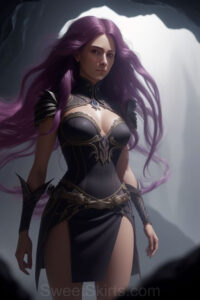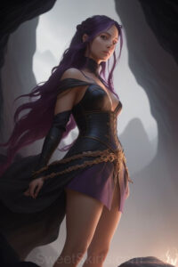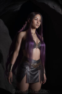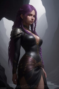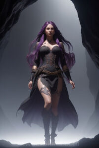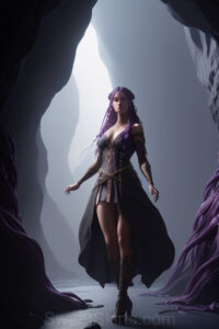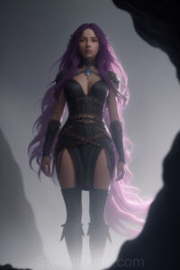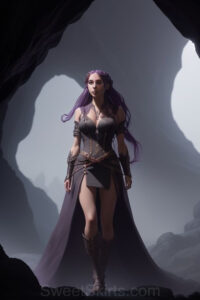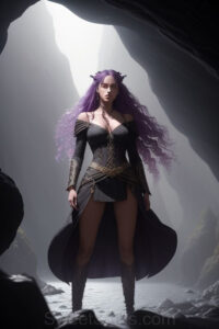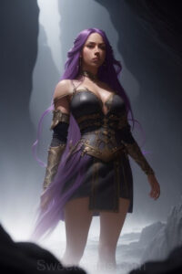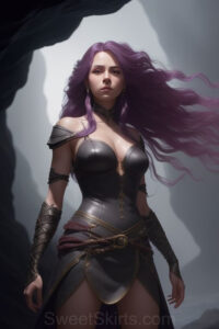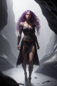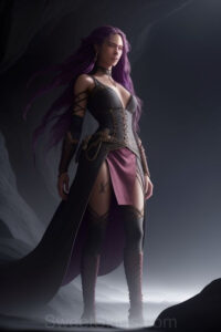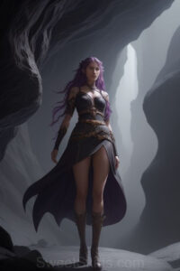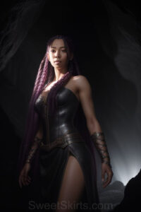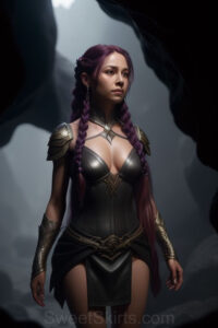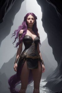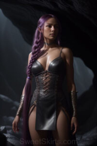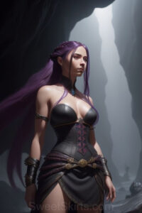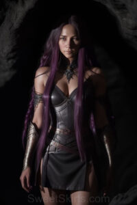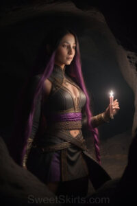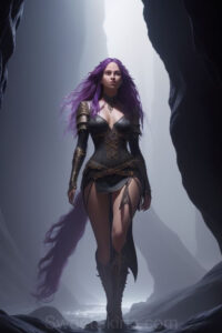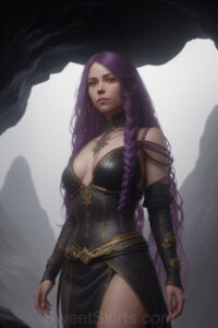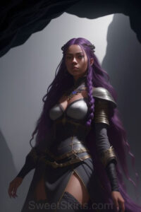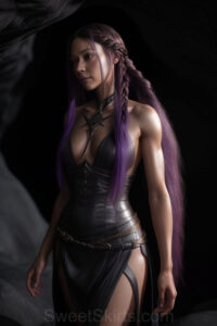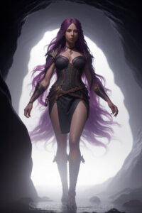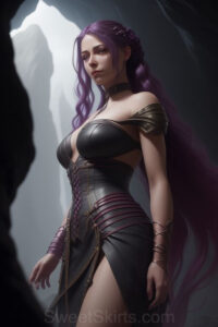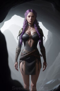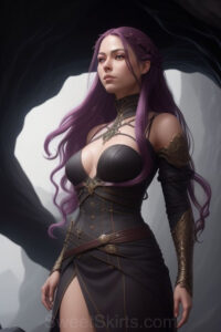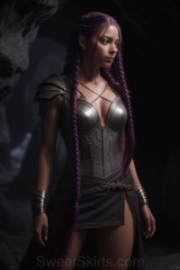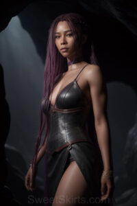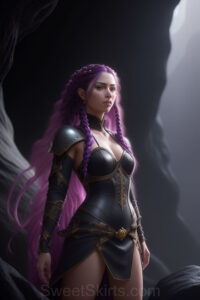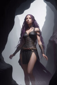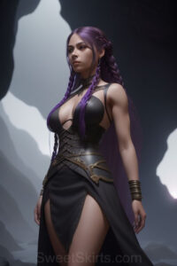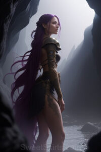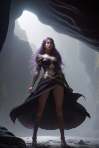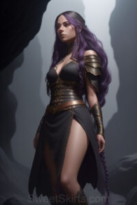 Dazzling images extremely attractive, pretty women of color with very long, flowing, purple and red, partially braided hair. They are wearing garmoutswith skirts from days of long ago, standing in front of, beside or in a cave setting. The atmosphere is mysterious, with shadows from the cave creating a dramatic contrast, and the lighting emphasizes their beauty and elegance in the scene.